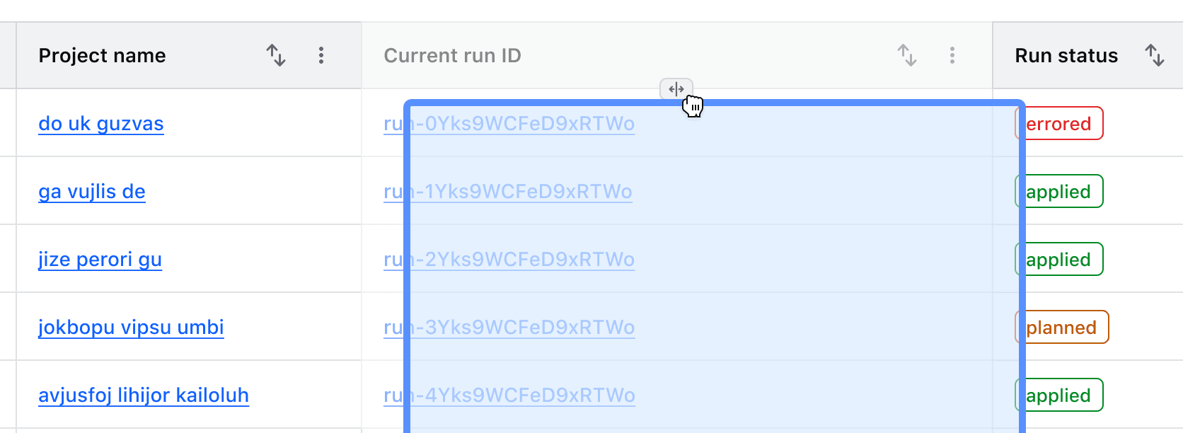 An example of a column being resized to the minimum default width