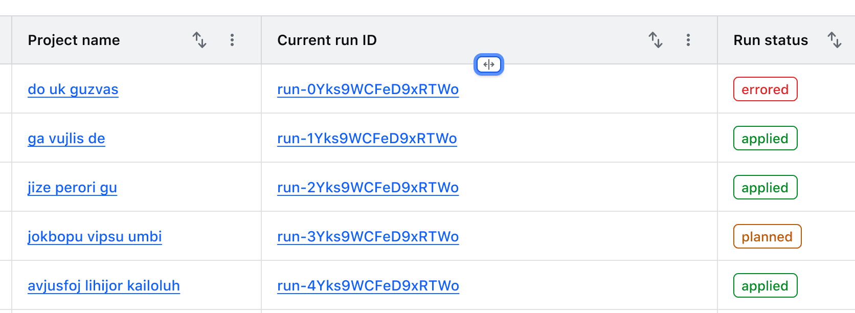 Columns can be resized by dragging the "resize border" with a mouse or by moving focus to it and using the left and right arrow keys.
