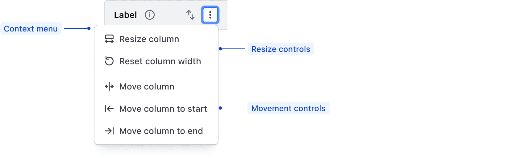 When resizable columns are enabled, actions related to each function are rendered in a context menu in the table header. These functions are not customizable.